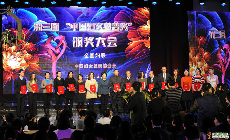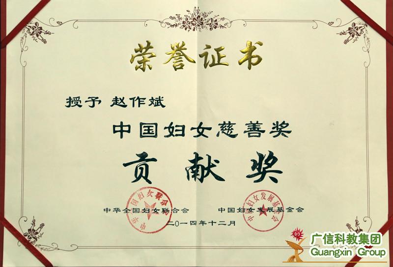 本網訊(記者 劉勝懷 通(tōng)訊員(yuán) 田天)2014年(nián)12月(yuè)30日(rì),全國(guó)婦聯、中國(guó)婦女(nǚ÷)發展基金(jīn)會(huì)主辦的(de)第三屆“中國(guó)婦女(nǚ)慈善獎”頒獎大(dà)會(huì)在京舉行(xíng),對(duì)2013-2014年(✘nián)度為(wèi)女(nǚ)性公益慈善事(shì)業(yè)做(zuò)出貢獻的(de)單位及個(gè)人(rén)進行(xíng)了(le)表彰。廣信科(kē)教集團董事(sh ì)局、總裁趙作(zuò)斌被授予“中國(guó)婦女(nǚ)慈善獎”貢獻獎榮譽£稱号,全國(guó)僅31人(rén)獲此殊榮。全國(guó)人(rén)大(dà)常委會(huì)副委員(yuán)長(ch≤áng)、全國(guó)婦聯主席沈躍躍,全國(guó)婦聯黨組書(shū)記、副主席、書(shū)記處第一(yī)書(shū)記宋秀岩為(wèi)獲獎的(de)單位和(hé)個(gè)人(rén)頒獎。集團副總裁呂家(jiā)燕女(nǚ)士代表趙總裁出席頒•獎典禮并領獎。
