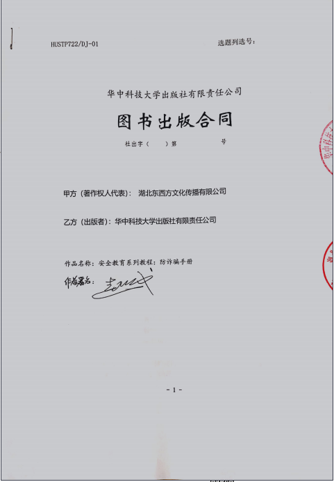2021年(nián)7月(yuè)24日(rì),東方市秋宗文化傳媒有限公司和(hé)華中科(kē)技(jì)ε大(dà)學出版社有(yǒu)限責任公司就(jiù)《安全教育系列教程:防詐騙手冊》出版事(shì)宜簽訂了(le)圖書(shū)出版合同和(hé)相(xiàng)關補充協議(yì) 。合同約定,《安全教育系列教程:防詐騙手冊》于7月(yuè)10日(rì)前完稿并交出版社,須于9月(yuè)1日(rì★)前完成出版印刷工(gōng)作(zuò),首次印刷達200000冊,作(zuò)為(wèi)秋季學年(nián)學生(shēng)課外(w☆ài)讀(dú)本。